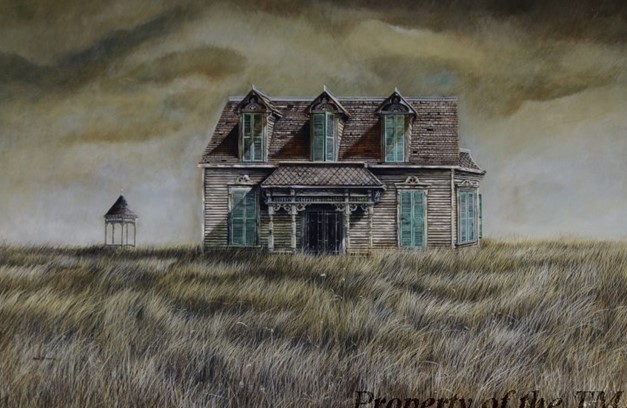 In Ancel Nunn’s painting, Landscape with Victorian Cottage and Gazebo, line is found in the following locations: